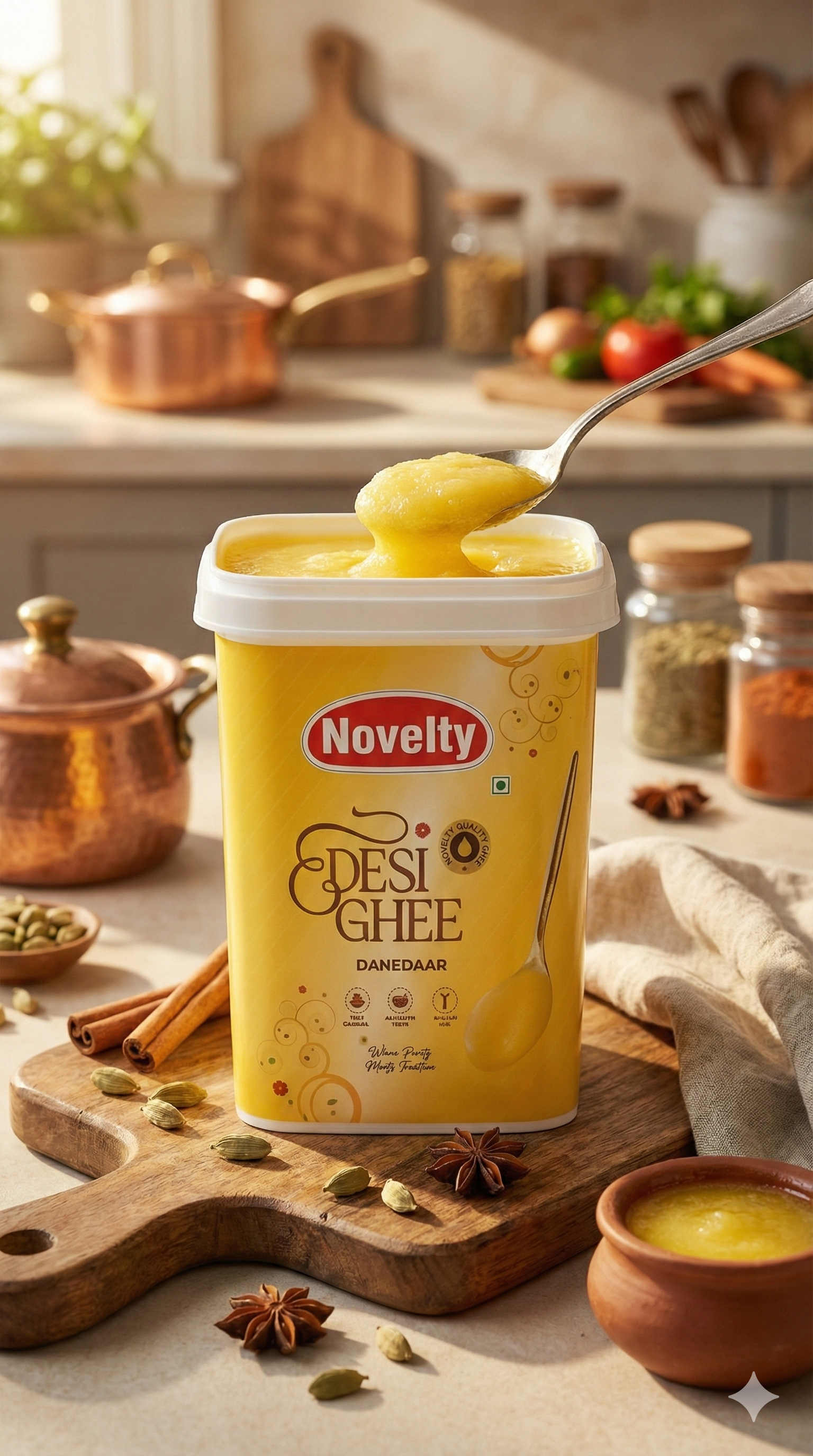 Novelty’s Ayurvedic Cow Ghee 5L, Hygienically Churned , Curd to Ghee, Packed with Vitamins A, D, E & K.